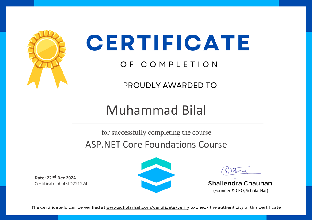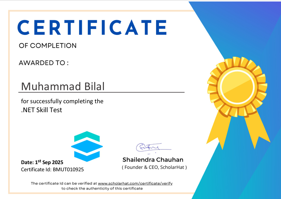 Certification in ASP.NET Core demonstrating expertise in modern .NET web development.