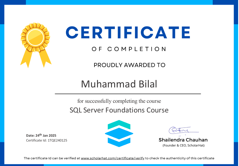 Certification demonstrating expertise in database design, optimization, and T-SQL queries.